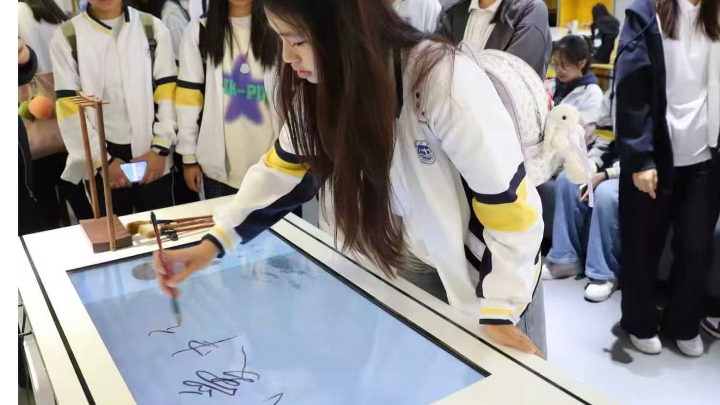 研学团队首站走进广东工业大学,实地参观图书馆学习空间、视听专区及信息共享平台,沉浸式体验无墨毛笔书写、无声钢琴弹奏、封闭亭朗读等数字化设施,深切感受智能化育人环境的浓厚氛围。在我校智慧教育产业学院合作企业——广州视睿电子科技有限公司(希沃品牌),师生们先后走访智慧教育展厅、未来教室、虚拟演播室及微格教室,亲身实践虚拟抠像、无尘书写、AI课堂教学等前沿技术,直观领略人工智能与教育教学深度融合的创新成果。