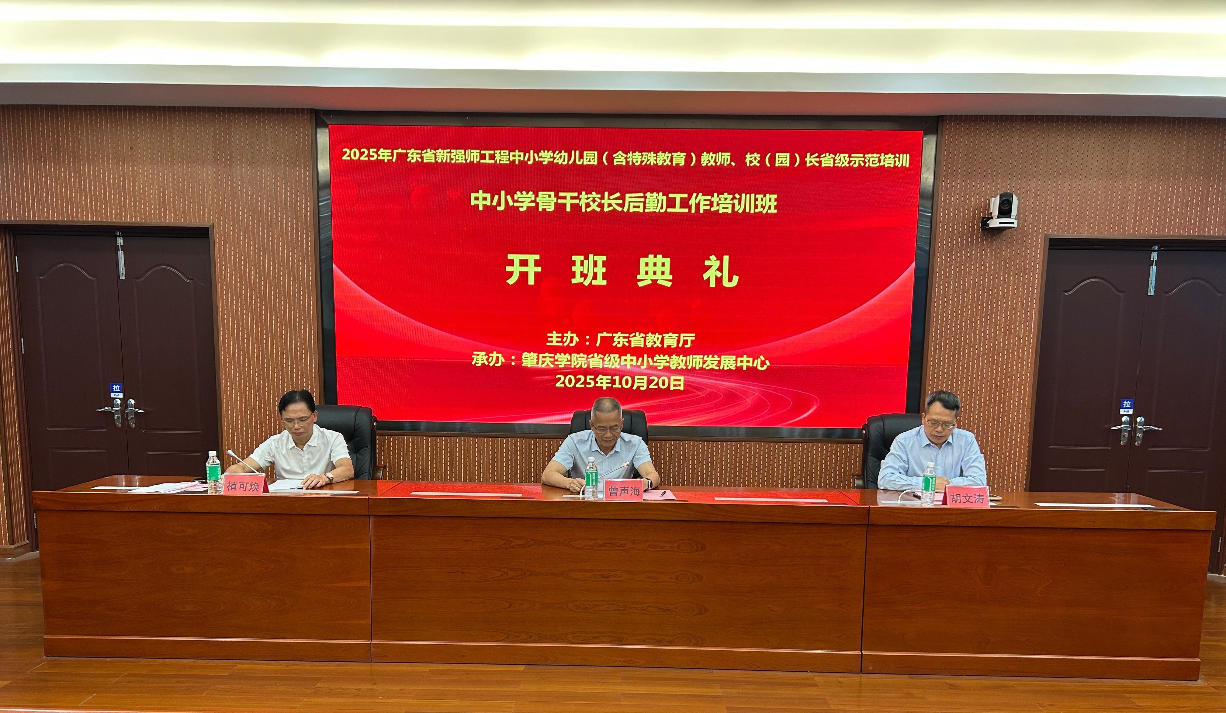 10月20日,广东省“新强师工程”中小学幼儿园骨干校长(园长)后勤工作培训班(第四期)在我校正式开班,来自全省21个地市的144名中学骨干校长参加培训。广东省教育厅二级巡视员曾声海、我校副校长胡文涛出席开班仪式,教师教育学院(教师发展中心)党总支书记植可焕主持。